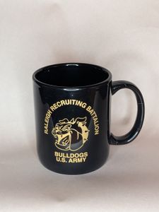 U.S. Army Raleigh Recruiting Battalion “Bulldogs” black ceramic mug with gold insignia.